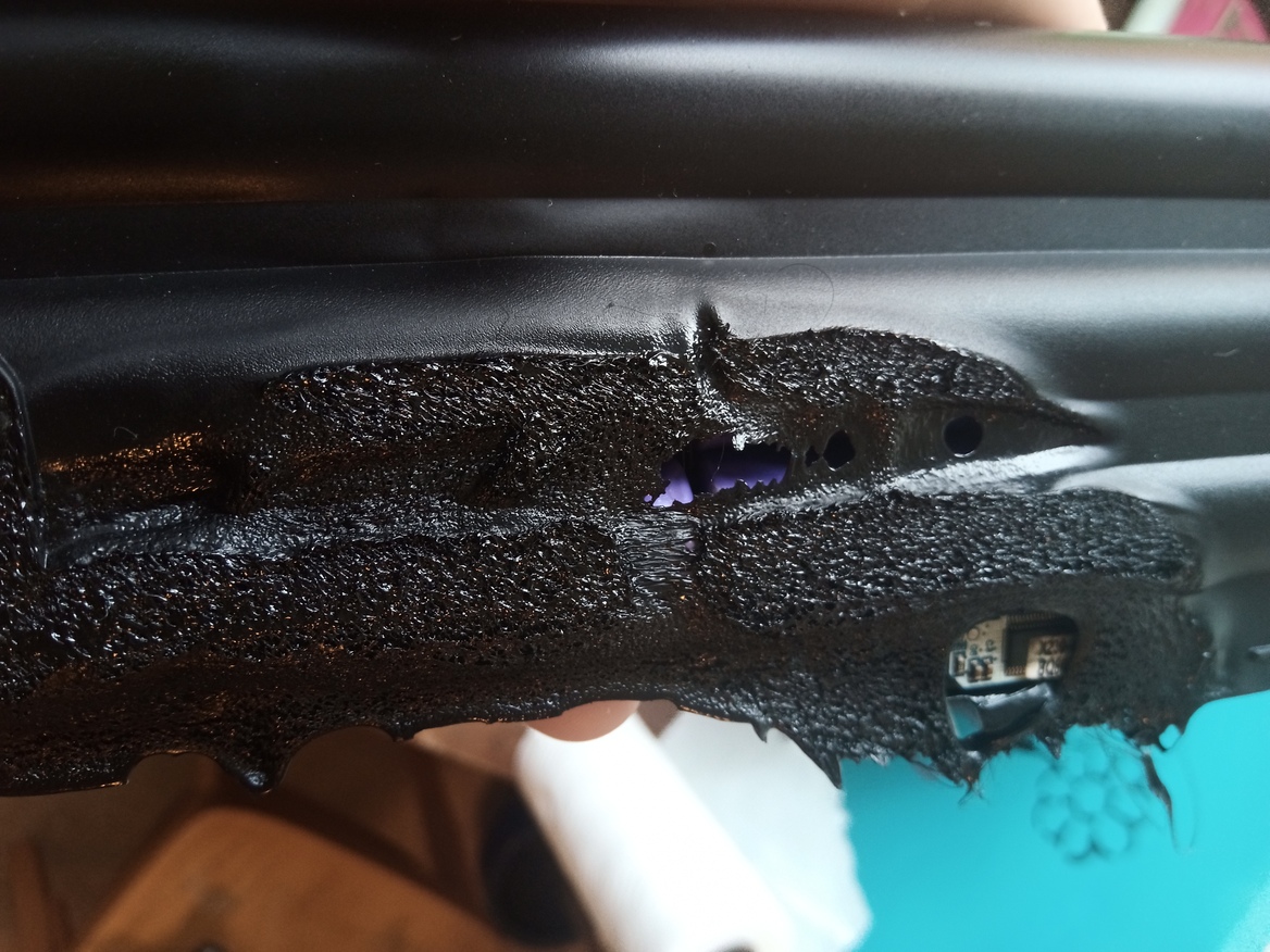 Unbeknownst to me, in my feverish stupor, the stovetop I turned on was not the one with the cold food on it, but my laptop. Its batteries compartment had started to melt, which very fortunately is detachable. You can even see the purple cells starting to show. The rest made it thanks to the magnesium chassis.